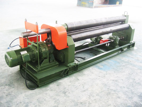本機結構型式為三輥對稱式,上輥在兩下輥中央對稱位置作垂直升降運動,通過絲桿絲母蝸桿傳動而獲得,兩下輥作旋轉運動,通過減速機的輸出齒輪與下輥嚙合,為卷制板材提供扭矩,本機床結構緊湊,操作維修方便。